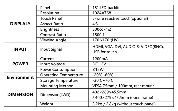 * Viewing angle: 170° / 170° (H/V)