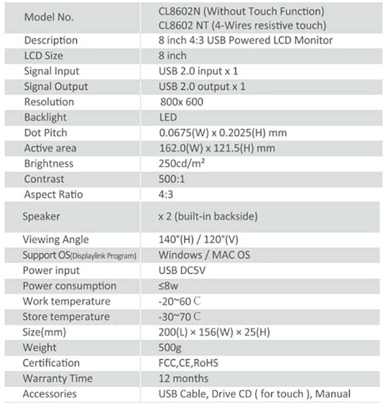 * 8” 4:3 TFT LCD USB Powered Monitor