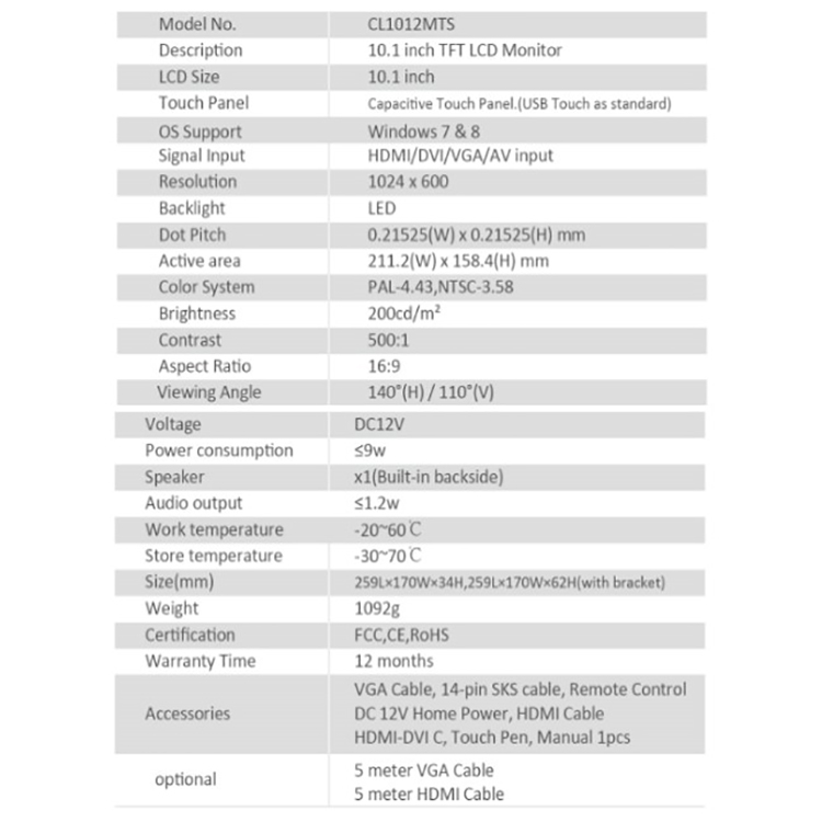 * 1024x600, 200cd, 16:9 Aspect Ratio