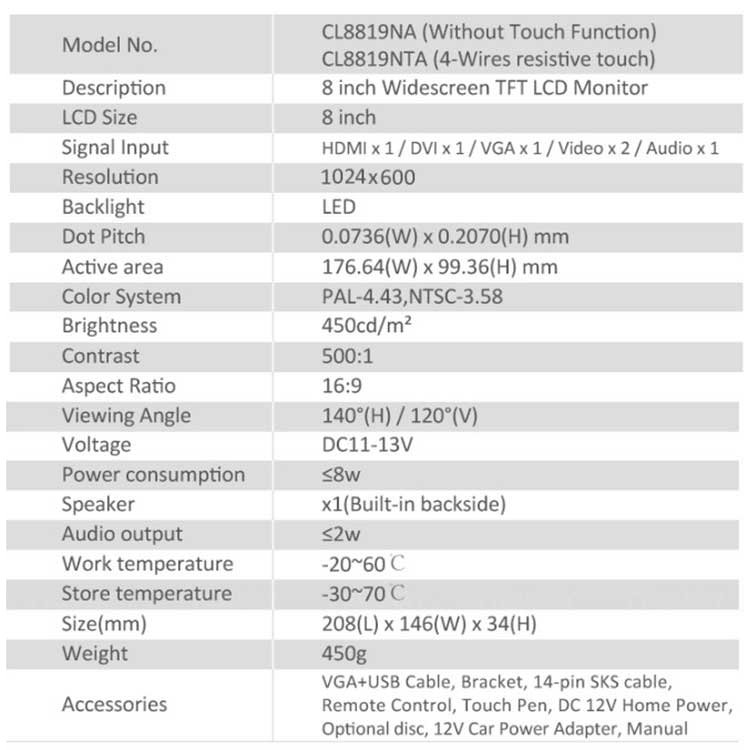 * 450cd/m2 Brightness,LED Backlight
