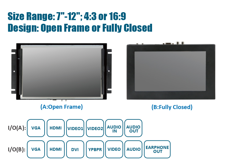 Open Frame LCD display is designed for commercial and industrial applications. Features wide operating temperature and touch screen capable; fulfill the demand for extreme environments. It offers the best visibility, performance and cost effective value. Perfectly suitable for kiosks, ATM, POS, medical, transportation, avionics, industrial automation, gaming, digital entertainment display and outdoor application.