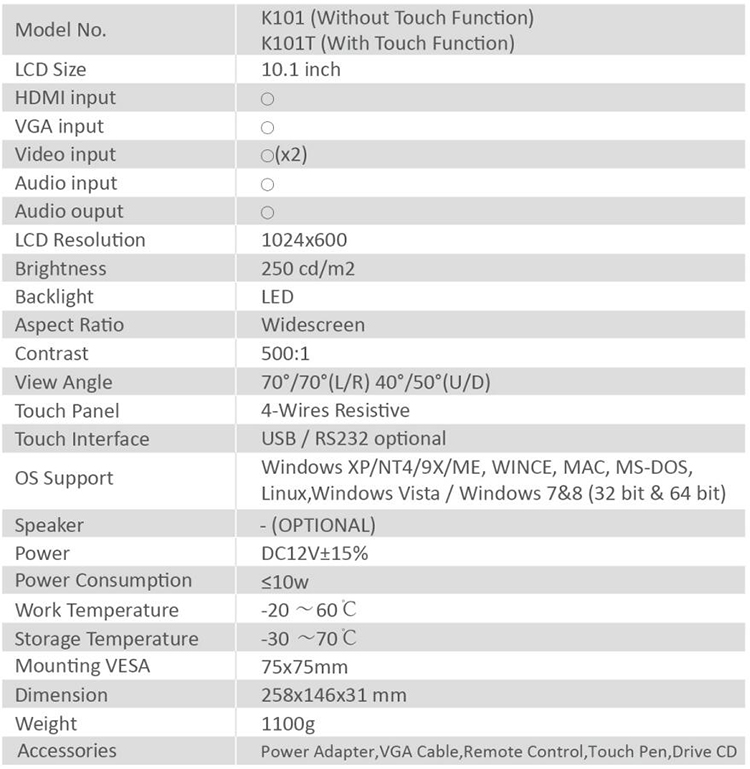 * 10.1 inch TFT LCD panel with resolution 1024x600