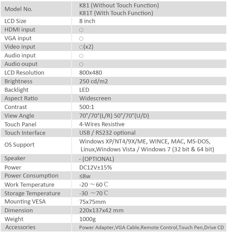 * 8 inch TFT LCD panel with resolution 800x480