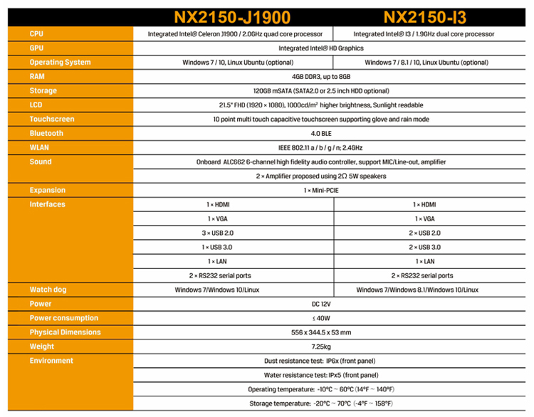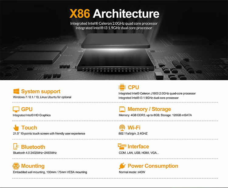 * Interfaces: HDMI, VGA, USB2.0, USB3.0, LAN, RS232