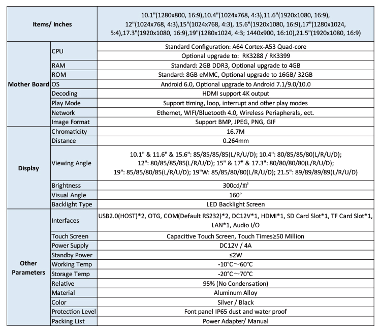 * 10.1" to 21.5” available, 4:3 or 16:9 Aspect Ratio Screen