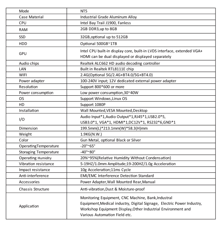 * I/O:Audio/RJ45/USB/VGA/HDMI/RS232