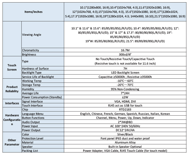 * 10.1" to 21.5” available, 4:3 or 16:9 Aspect Ratio Screen