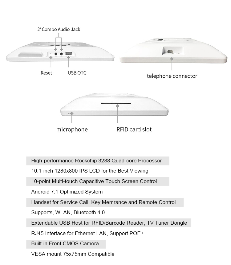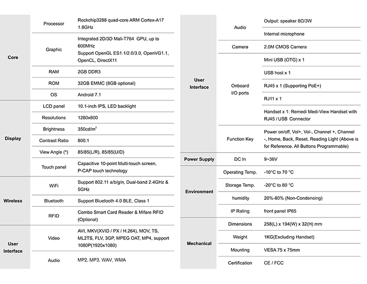 * WIFI/ BT/ Camera/ POE, Optional RFID