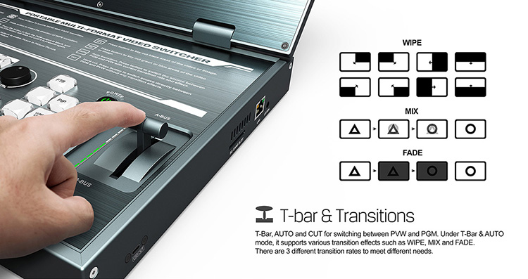 * T-Bar/ AUTO/ CUT transitions and MIX/ FADE/ WIPE effects