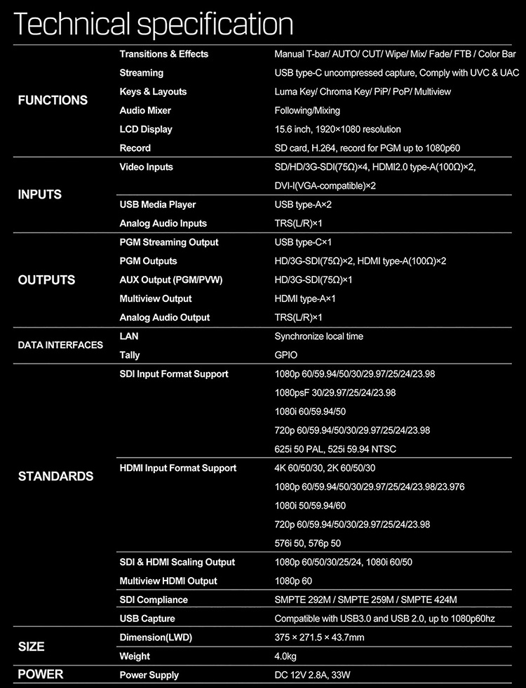 * Audio mixer: TRS audio & SDI, HDMI, USB embedded audio