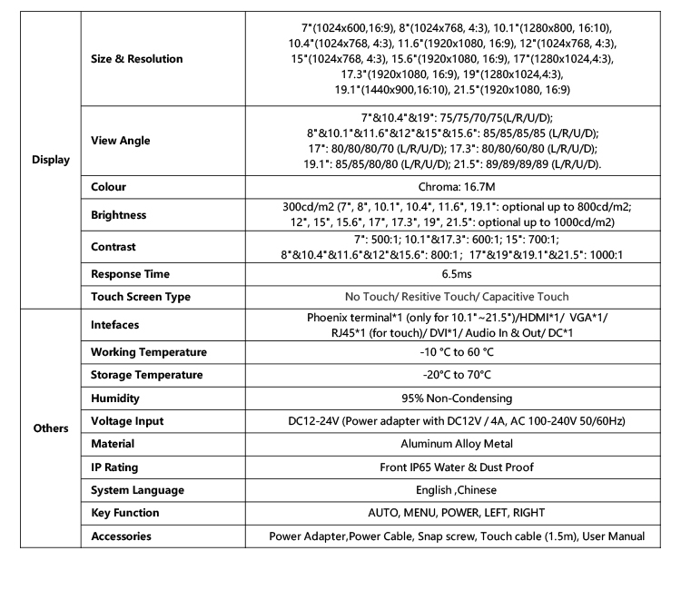 * 7" to 21.5” available, 4:3 or 16:9 Aspect Ratio Screen