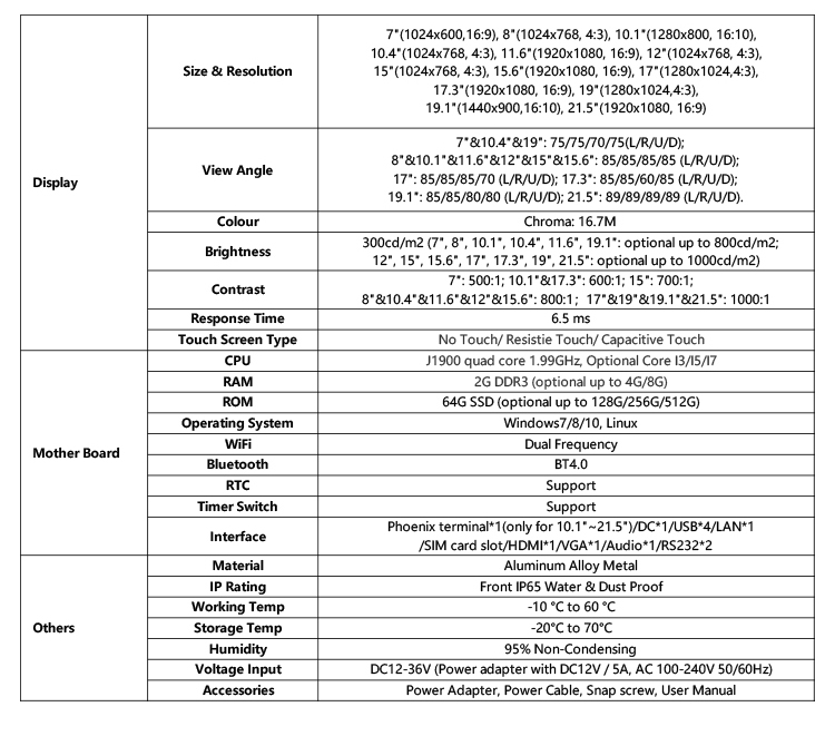 * 7" to 21.5” available, 4:3 or 16:9 Aspect Ratio Screen