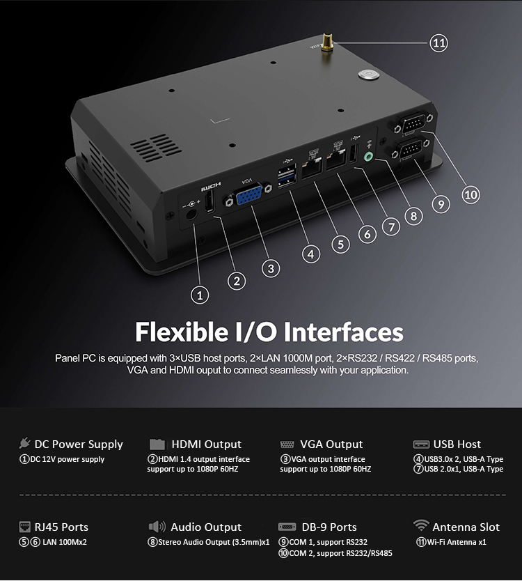 * Rich Interfaces: LAN, VGA, HDMI, RS232, RS485, USB2.0, USB3.0
